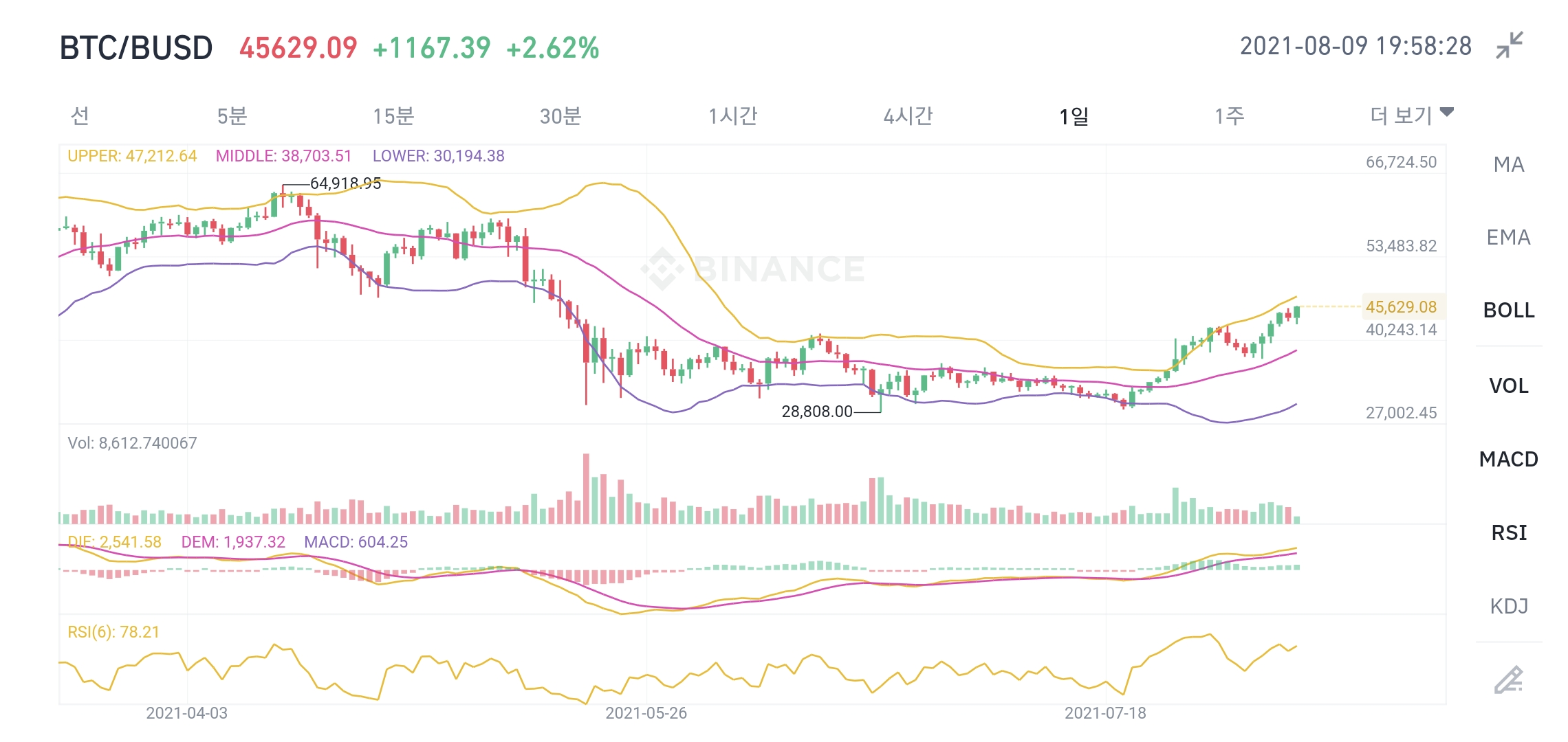 45K 위로 갔던 비트코인은 일시적으로 조정을 받는 모습을 보이고 있는